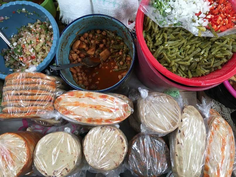 Es difícil encontrar comida tradicional en esta localidad pero los martes, jueves y sábados encontrarás gorditas de maíz quebrado con queso y chile, de frijol o piloncillo, salsa de xoconostle y guiso de haba. Están frente al puesto de zapatos y muy cerca de los locales donde venden artesanías.