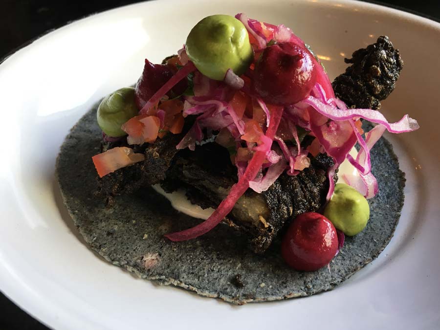 Te recomiendo el Taquito negro que lleva la pesca del día capeada y con tinta de calamar, acompañada con cebolla encurtida, pico de gallo, cremoso de aguacate y rajitas de rábano, en una tortilla de maíz azul. Esta es una forma creativa para comer esos célebres tacos de pescado de la zona.