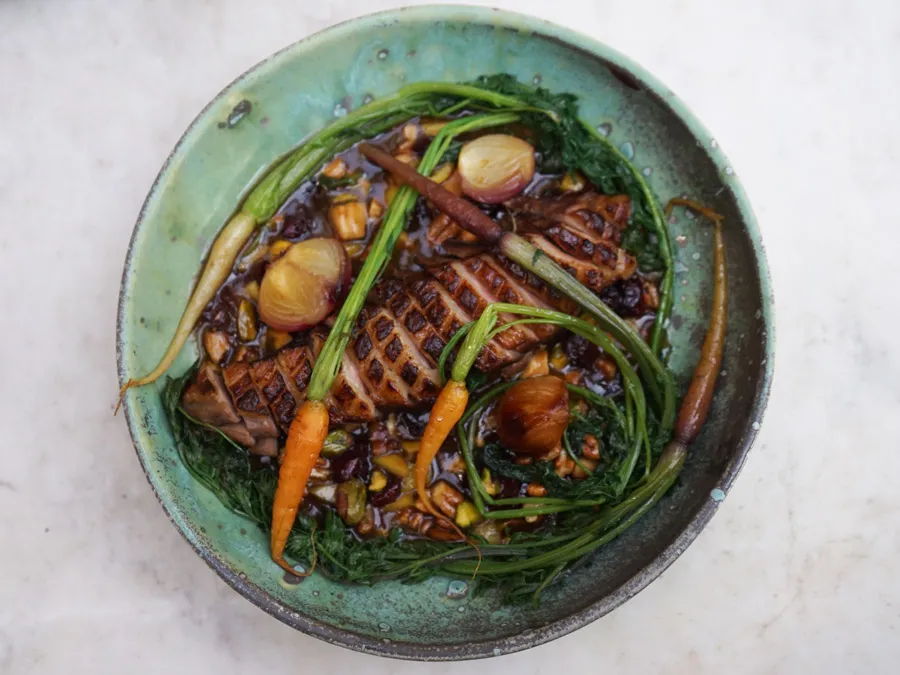 Como entrada pide el espectacular Macaron de foie gras con frutos secos y palanqueta, un bocado nada pesado y de sabores sorprendentes; el pato en salsa de miel y naranja confitada, que lleva entre otros secretos, jengibre, para esas notas picositas, así como elementos que exaltan los sentidos, como miel y una vinagreta de limón quemado, que en palabras de este cocinero son “súper sexis” y “una parte muy cachonda” y ligera en boca, pensando en el beso que te vas a dar después (este antojable platillo es el que ilustra la portada de esta nota). Otro sugerido es la pesca del día con ensalada de raíces.