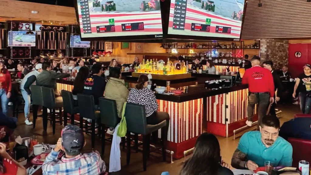 Experiencia: Boliche profesional, simuladores de F1, cajas de bateo y más de 50 pantallas tipo estadio; disfruta fish & chips jalapeño y la “Burger NASCAR” mientras ves torneos de NFL y Champions.