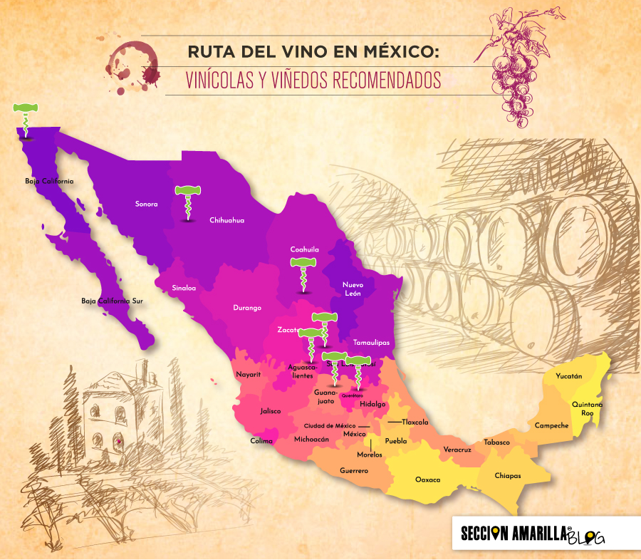 Baja California, Coahuila, Querétaro y Guanajuato son las regiones vitivinícolas más conocidas, pero otros estados como Aguascalientes, Chihuahua, Durango y más también son productores de vino a menor escala.
