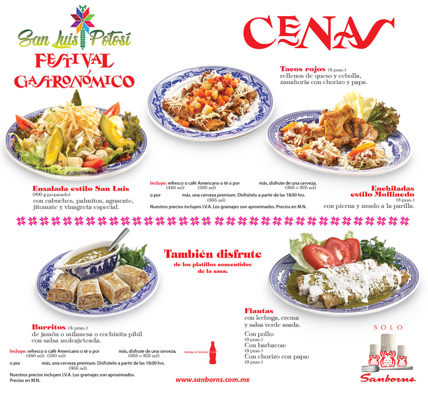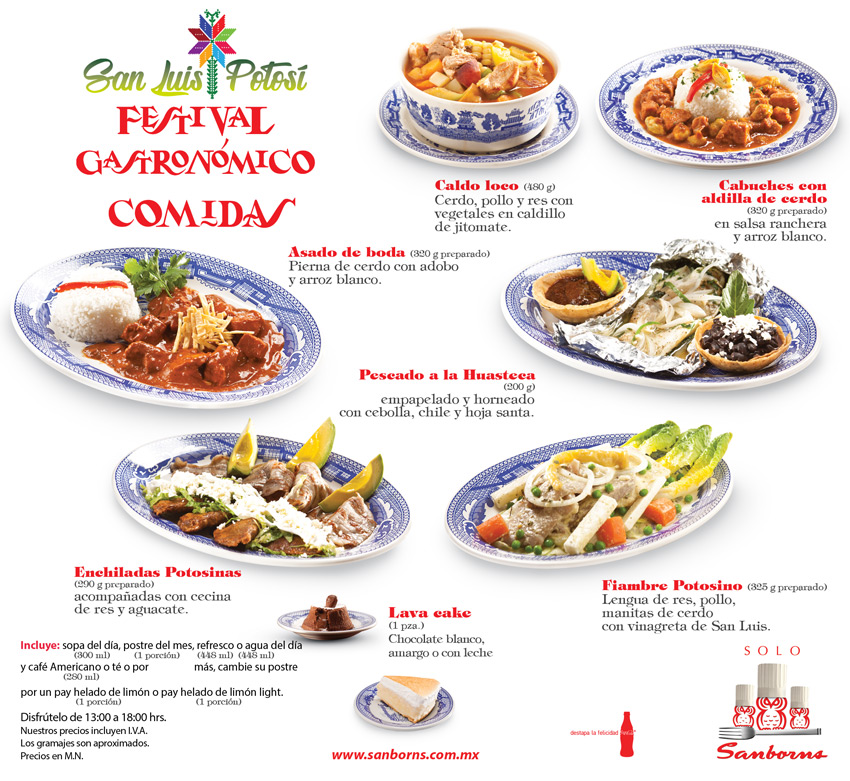 La gastronomía potosina llega durante junio a los desayunos, comidas y cenas en los restaurantes de la cadena Sanborns. Con este festival gastronómico se busca promover a ese destino a nivel nacional.