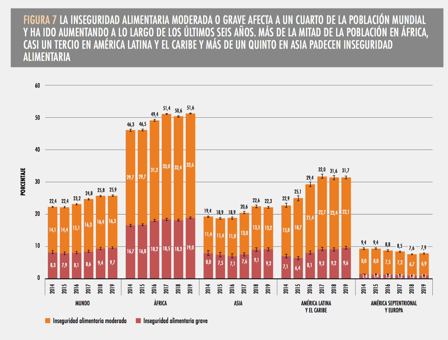 En la actualidad cerca de 690 millones de personas padecen hambre en el mundo. En 2019, cerca de 750 millones de personas —es decir, casi una de cada 10 personas— sufren de inseguridad alimentaria. Si continúan las tendencias recientes esta cifra superará los 840 millones para 2030.