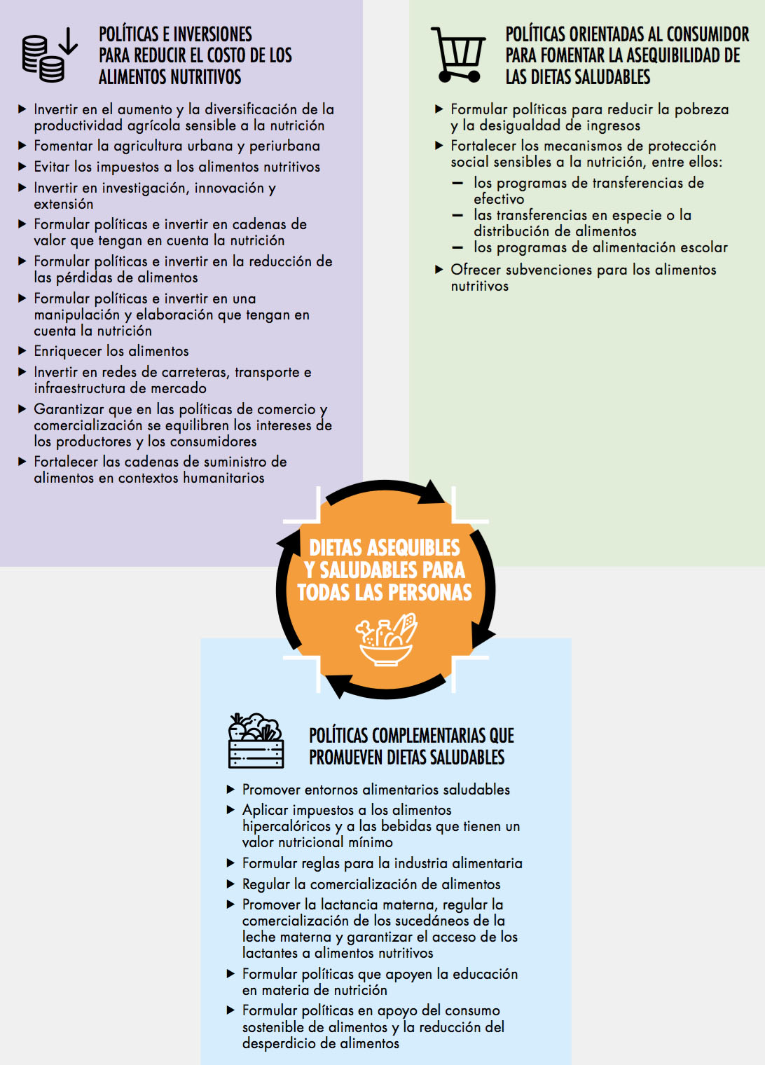 Las políticas de protección social que tomen en cuenta el ámbito nutricional serán esenciales, así como el impulso a favor de las dietas saludables. Añaden que hay que sensibilizar e influir en el comportamiento del consumidor y lograr sinergías importantes para la sostenibilidad medio ambiental.