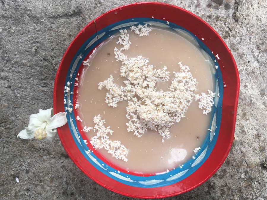 La técnica del batido del tejate requiere meticulosidad y una temperatura especial del agua, pero sobre todo de la mano. Se agrega hielo y se mueve manualmente hasta que la espuma, o “la flor” como ellos le llaman, crezca y corone cada vaso o jícara. Al final, endulzan con un poco de jarabe de azúcar.