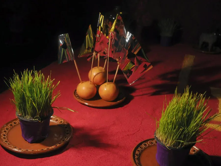 También se observan pequeñas macetas de barro en forma de animales con semillas germinadas que representan la eucaristía y naranjas adornadas con banderitas doradas que remiten al dolor de la virgen.