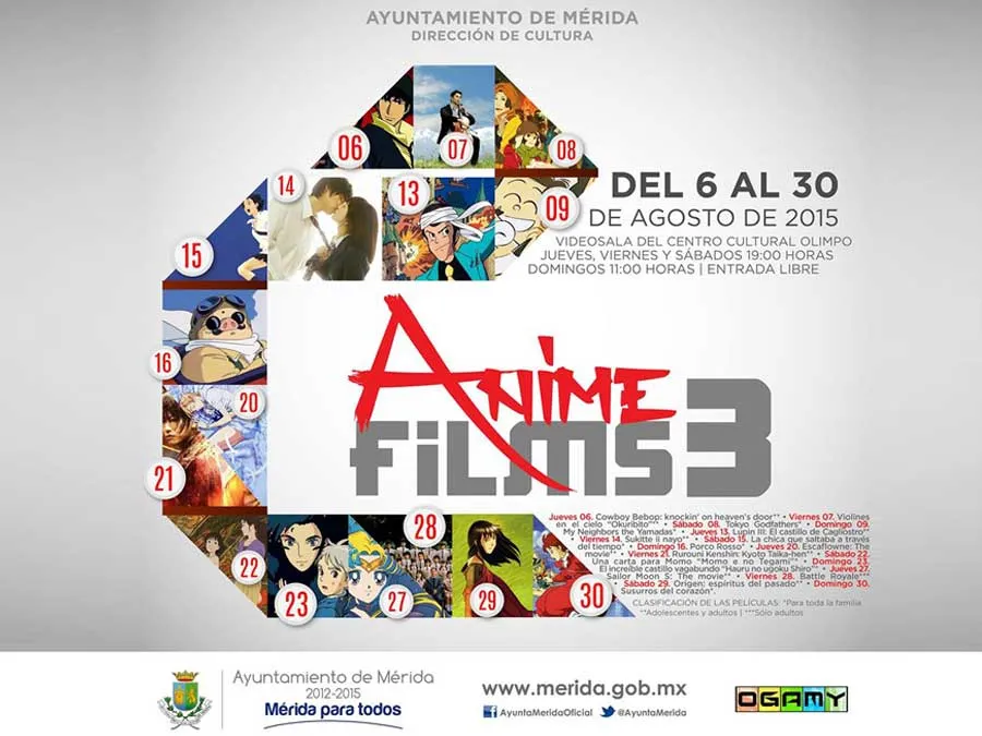 En su tercera versión, Anime Films se presentará los fines de semana del 6 al 30 de agosto en la ciudad de Mérida Yucatán en la video-sala Centro Cultural Olimpo.