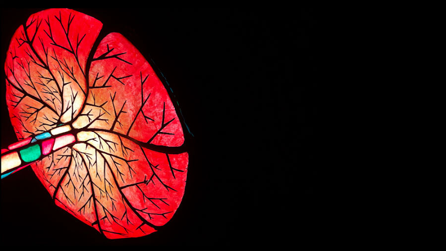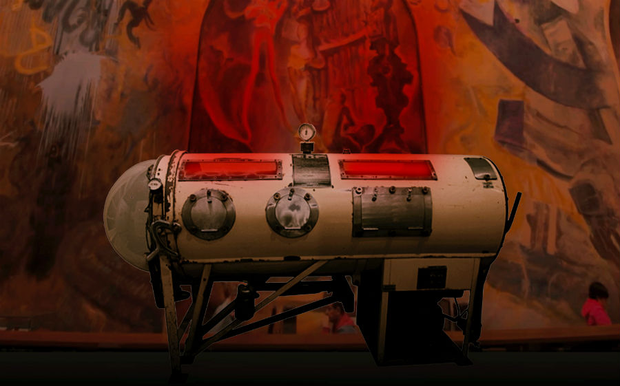 En el mismo lugar, pero al interior te toparás con esta obra de Marcelo Schuster. Se trata de un objeto-fósil pulmotor entre los murales de Vlady que están en la biblioteca, y hace una crítica hacia las revoluciones.
