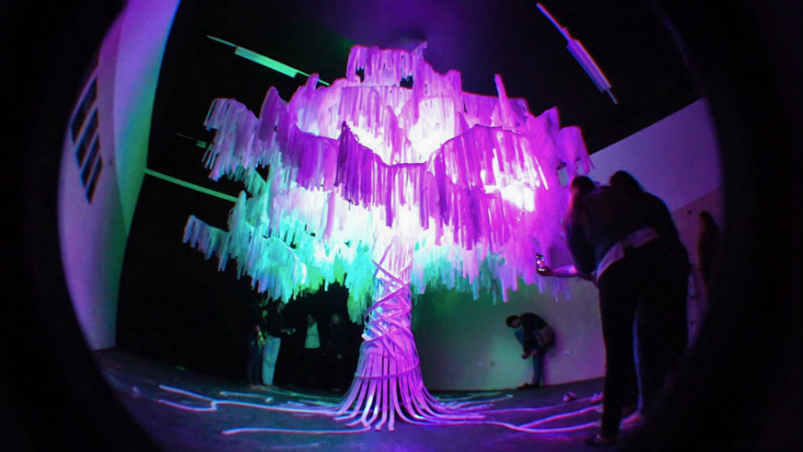 Josué Abraham hizo esta pieza en el Museo de Arte de la SHCP con luz y materiales reciclables que ¡puedes tocar! Contrario a otras obras de arte, la escultura que presenta el artista es totalmente interactiva y funciona así: cuando te acercas y le das la mano al árbol, este se enciende.