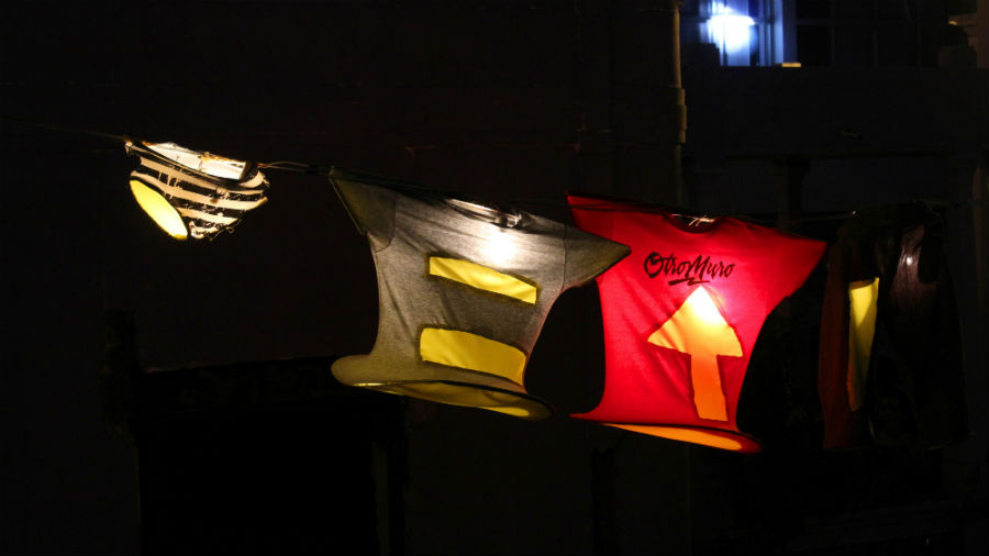 El recorrido continúa en el callejón de San Ildefonso, donde los colectivos OOSPP y Amarillo Público armaron tendederos con ropa y sensores de luz para que cada que pases haya destellos y sonido.