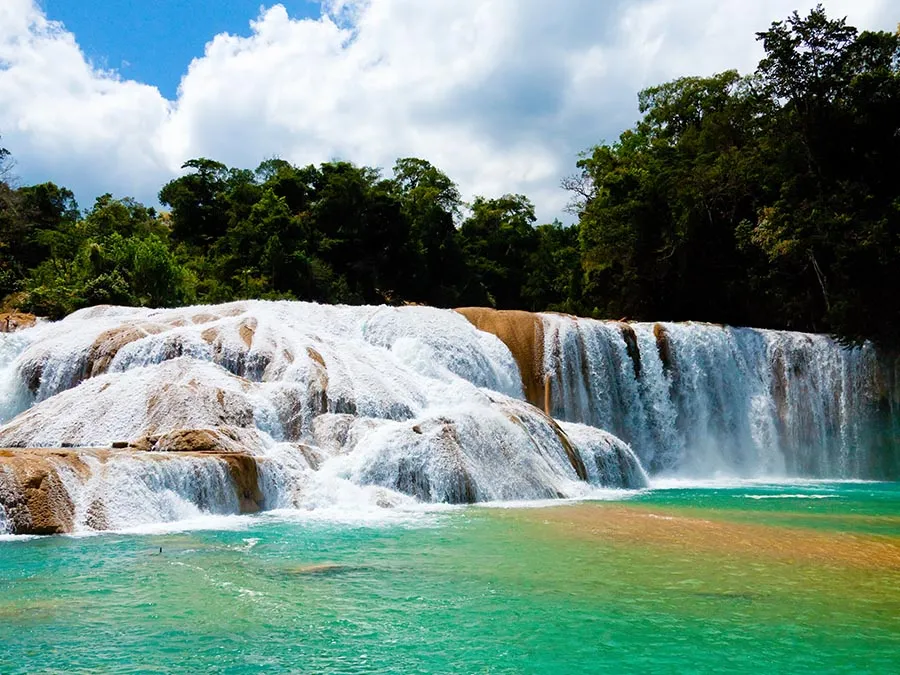Esta es una de las cascadas en Palenque más famosas y hermosas que existen, y es que solo con leer su nombre ya te podrás imaginar de qué va. Esta cascada escalonada es conocida por su hermoso color turquesa y las diversas alturas de su cauce.