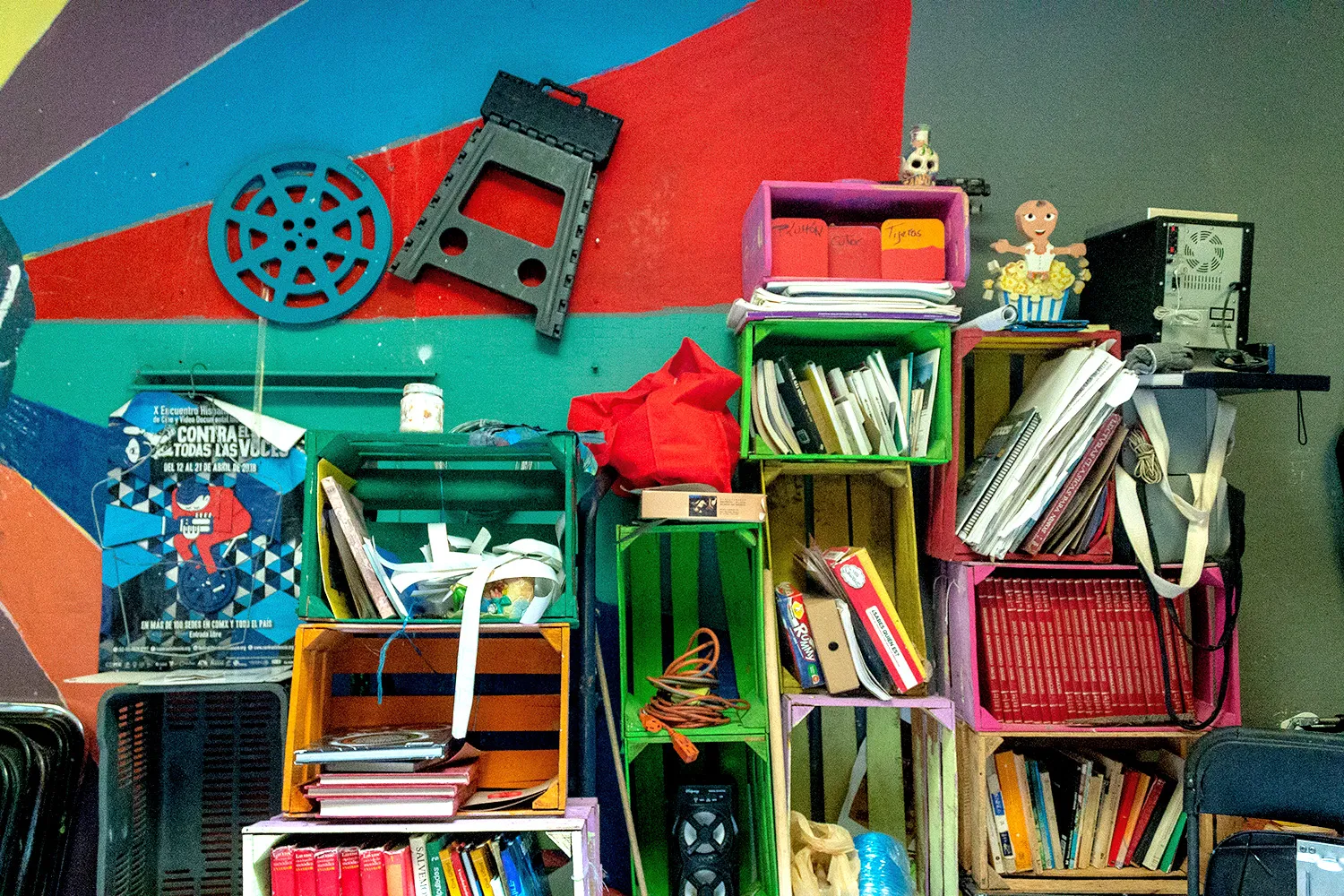Las paredes son de color azul cielo. Aunque el tono poco se puede apreciar, pues las paredes están repletas de estantes de libros, en su mayoría donados por los colaboradores de Keren Tá. También hay marionetas y máscaras de cartón colgadas, fruto de algunos de los talleres del centro donde se integra a los niños para que por “medio del arte y la cultura se den cuenta que pueden tener una vida diferente”.