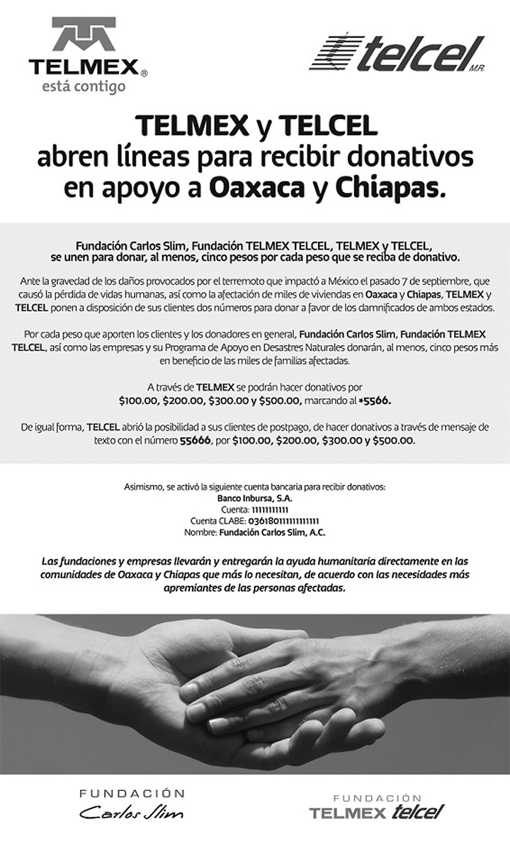 Fundación Telmex, Telmex, Telcel y Fundación Carlos Slim se unieron a esta causa y comunicaron que donarán, al menos, cinco pesos por cada peso que la gente done y puede hacerse de las siguientes maneras: