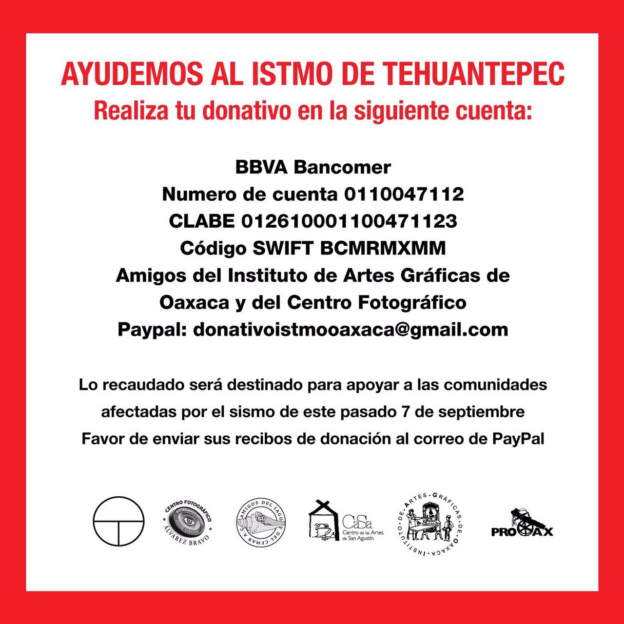 Francisco Toledo, importante líder y artista oaxaqueño, llama a que se hagan donativos a través de la cuenta de la fundación Amigos del Instituto de Artes Gráficas de Oaxaca (IAGO) y del Centro Fotográfico Manuel Álvarez Bravo. Es sabido por muchos que este oaxaqueño es humanitario y trabaja por varias causas sociales desde hace años: