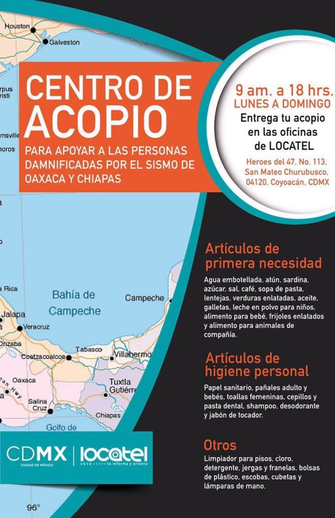 Los gobiernos de Chiapas, Oaxaca y la Ciudad de México, así como diferentes restaurantes, centros culturales y organizaciones civiles habilitaron centros de acopio, así que hicimos una selección para apoyar y se está actualizando de manera regular. Los tachados son los que ya dejaron de recibir donativos y seguimos añadiendo alternativas así que lee esta nota hasta el final.