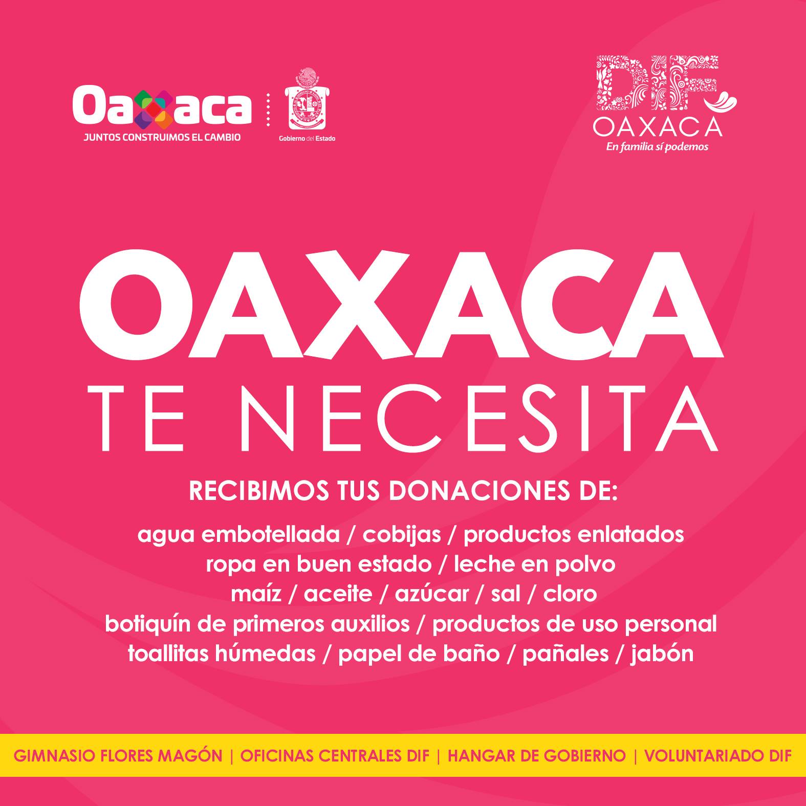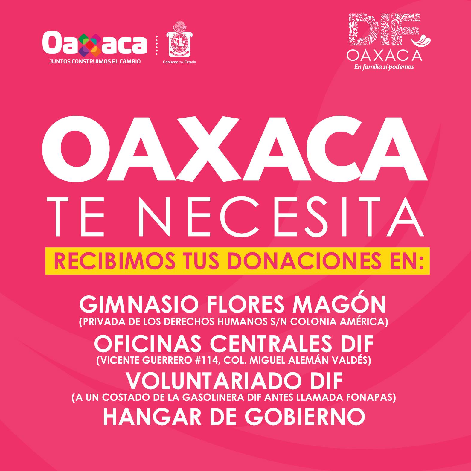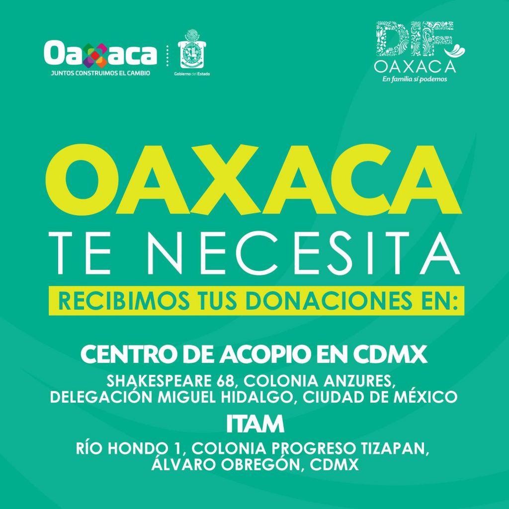 DIF Oaxaca publicó que tiene un centro de acopio en Shakespeare 68, colonia Anzures, y en el ITAM, en Río Hondo, colonia Progreso Tizapán: