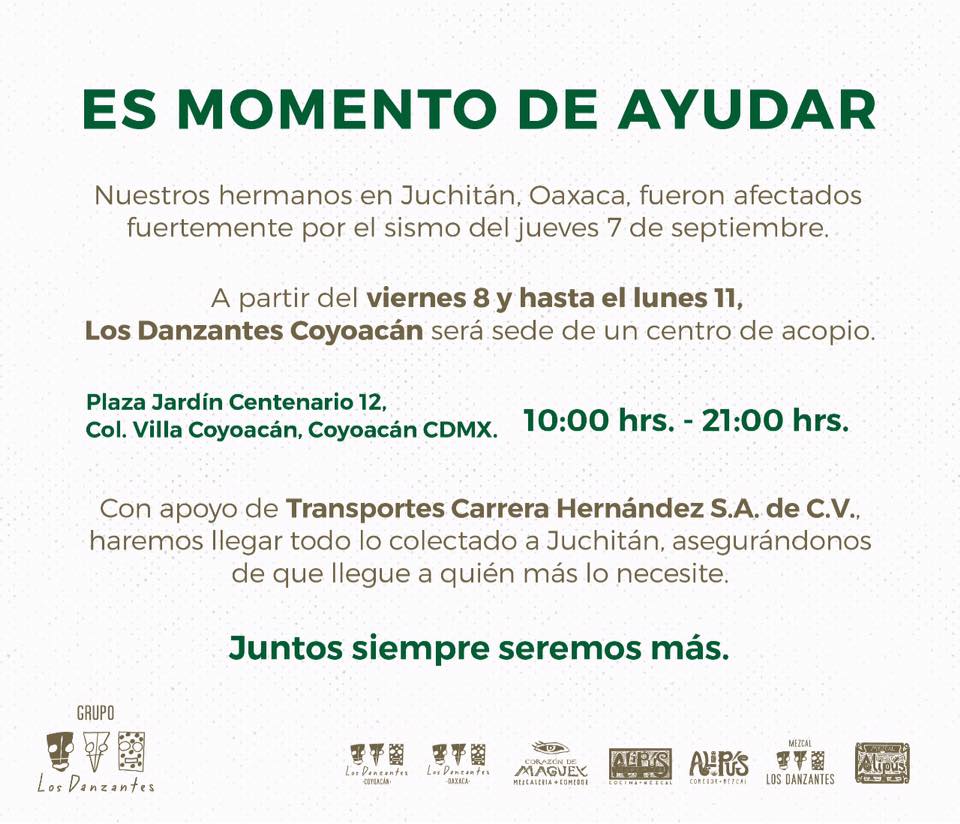 Los restaurantes Alipús Condesa (Aguascalientes 232, colonia Condesa) y Los Danzantes Coyoacán (Plaza Jardín Centenario 12, colonia Villa Coyoacán) también apoyará a los afectados del istmo oaxaqueño: