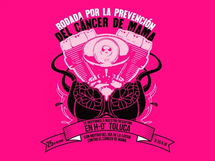 Harley Davidson se une a la causa del mes rosa este 25 de octubre con un desayuno-rodada por la prevención contra el cáncer de mama. Lo recaudado en el desayuno que se realizará en su sucursal de Toluca y en la venta de artículos marcados, generalmente accesorios para mujer, se donará al DIF Ocoyac; institución de salud pública que atiende a mujeres con este padecimiento.