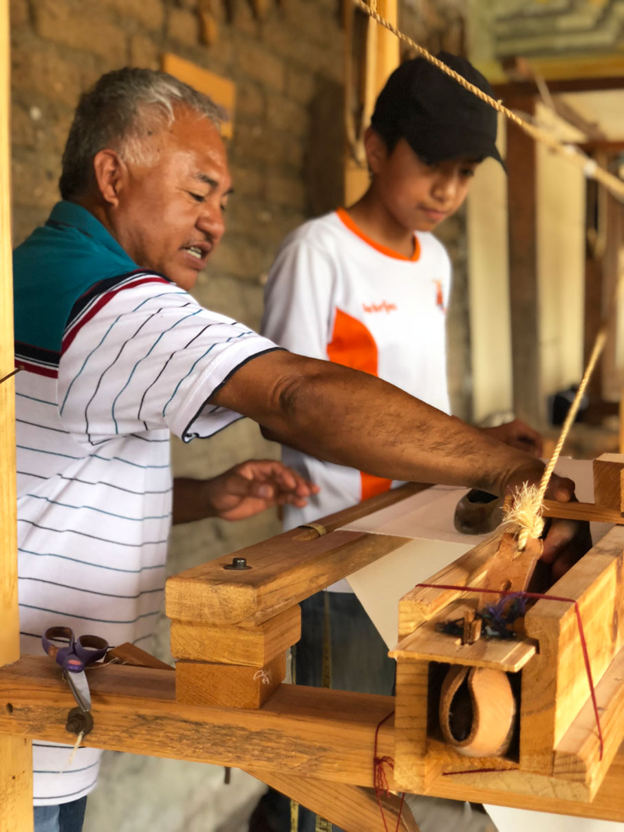 Todos ellos trabajan el telar de pedal, tienen 16, dispersos en el patio de su hogar. Saben que cada uno tiene su ritmo. La coordinación es necesaria: se inicia a la edad en la que ya se alcanzan los pedales, como su sobrino Víctor, que ya con 12 está ahí haciendo su música.