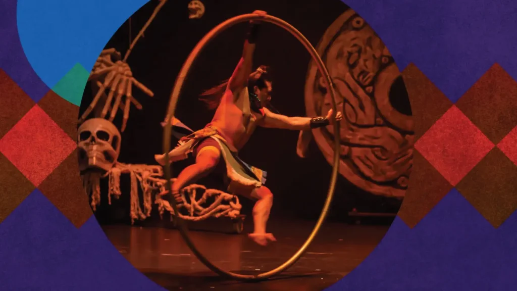 Circo contemporáneo que reinventa mitos mayas con acrobacias y narrativa teatral.