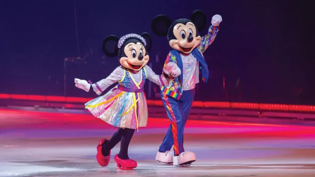 Espectáculo sobre hielo con patinaje artístico, música de Disney y coreografías interactivas.