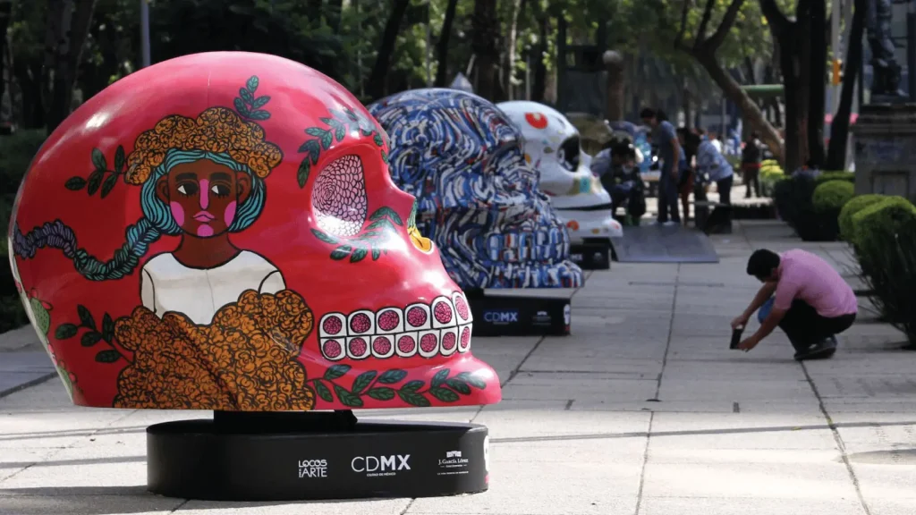 Instalación monumental que celebra la tradición mexicana del Día de Muertos con calaveras gigantes y arte público.