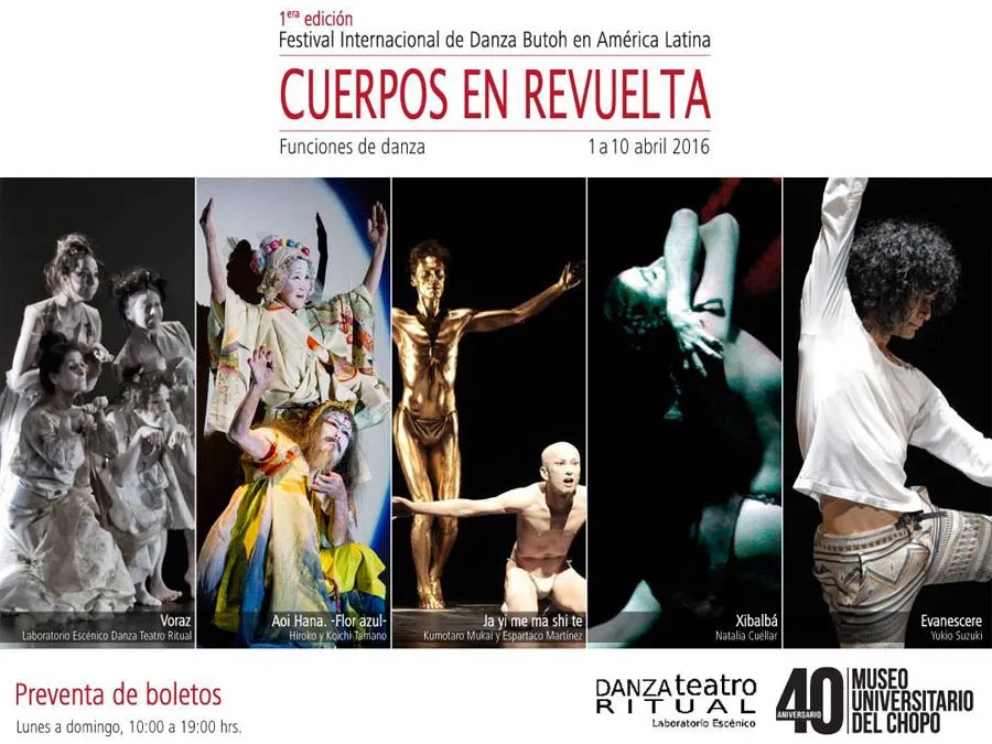 El Museo Universitario del Chopo y el Laboratorio Escénico Danza Teatro Ritual (LEDTR) realizarán la primera edición de Cuerpos en Revuelta Festival Internacional de Danza Butoh, del 31 de marzo al 14 de abril de 2016, en el cual participarán importantes figuras del Butoh japonés y latinoamericano.