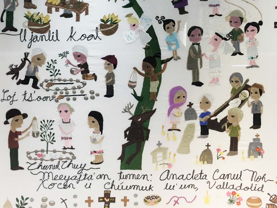 Una de mis secciones favoritas fue encontrar cuadros bordados por mujeres mayas como Anacleta y María de Jesús Canal de Xocen. En ellos se ven escenas de tradiciones mayas prehispánicas como u jaanlil kool, loj ts’oon y chunul chuy para la bendición de la milpa, los cazadores o las bordadoras, así como los rituales de bautizo, boda y funeral occidentales, adoptados con la Conquista.