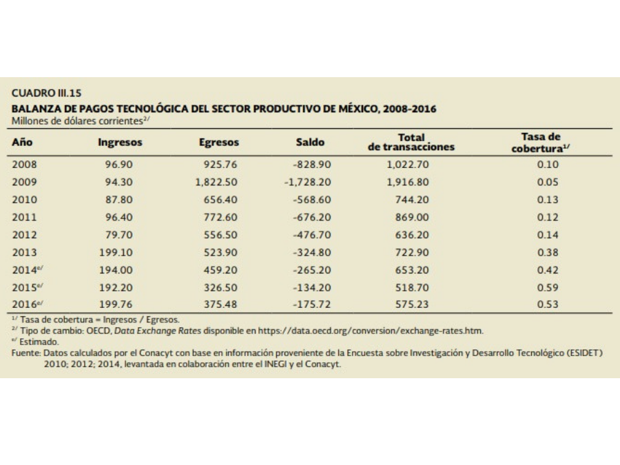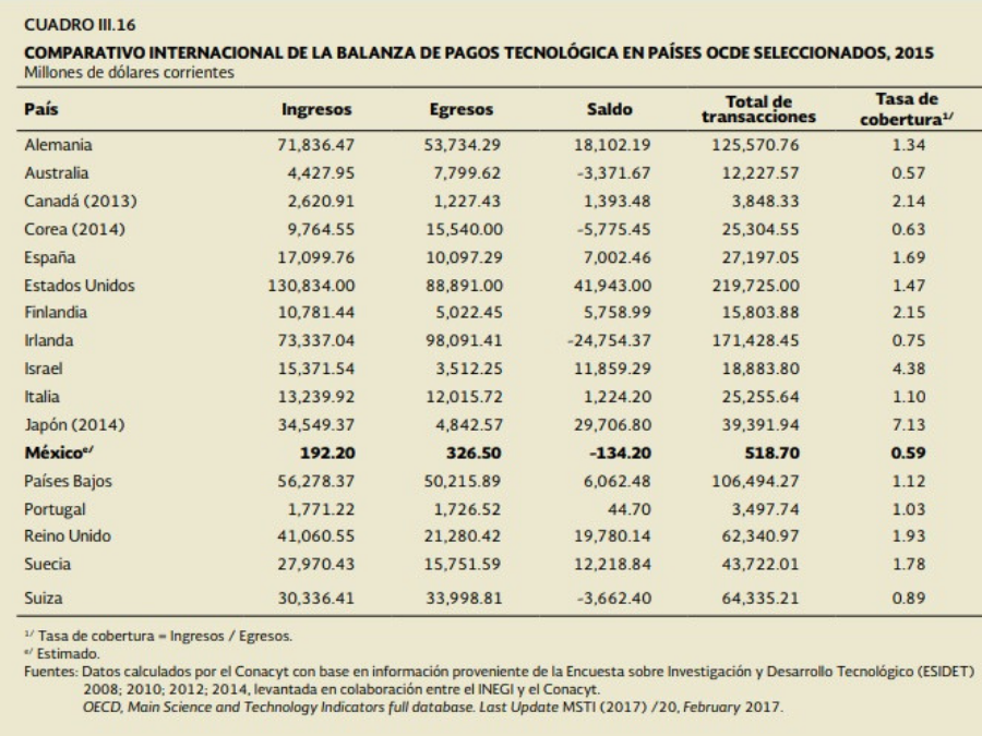 Sin embargo, en términos generales proporcionados por el Conacyt, México es un país que gasta más en tecnología de la que produce, invierte poco para ciencia y tecnología, tiene un índice bajo de investigadores de acuerdo con la OCDE y se conceden pocas patentes nacionales.