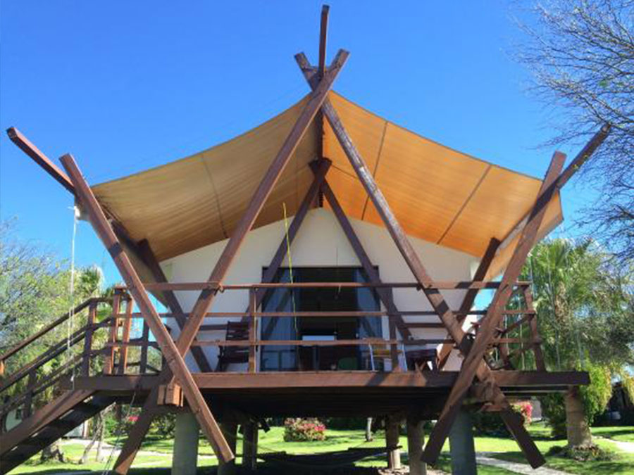 En la Isla Tzibanzá solo existen 8 cabañas, por lo que debes tomar precauciones y reservar con anticipación. Aunque pocas, este hospedaje posee una bella arquitectura que eleva el cuarto del suelo para cubrirlo con elegantes telas blancas.