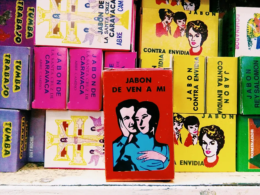 En sus locales puedes encontrar de todo. Yo me topé con amuletos, velas (hay surtido rico), aceites, imágenes religiosas, esculturas, tótems, muñecos para la práctica del chamanismo, la magia negra y la magia blanca, polvos mágicos y jabones esotéricos para el amor. Todos prometen atraer o retener a esa persona que tanto queremos; lo único que los diferencia es la presentación y el costo que va desde los $20 hasta los $40 pesos (estos ya son más sofisticados porque traen feromonas y hasta una esencia para darle un punch extra a la plegaria). Yo, como buena principiante, elegí los baratos.