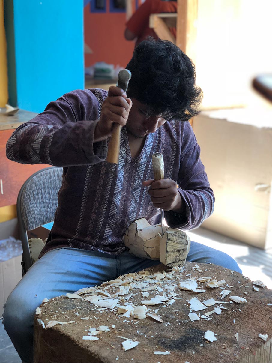 “Nosotros nos basamos en la cultura zapoteca de Mitla y Monte Albán y los hacemos con madera de copal”, cuenta David Fabián, nuestro guía en el lugar. “La madera cuando es verde es muy húmeda, es más suave y fácil tallar”, agrega.