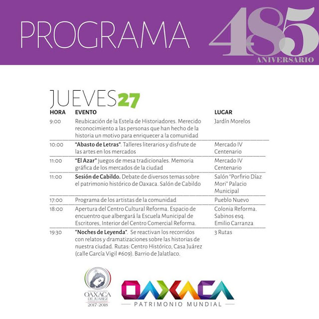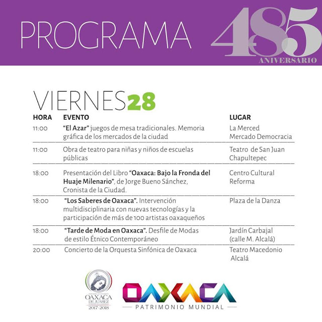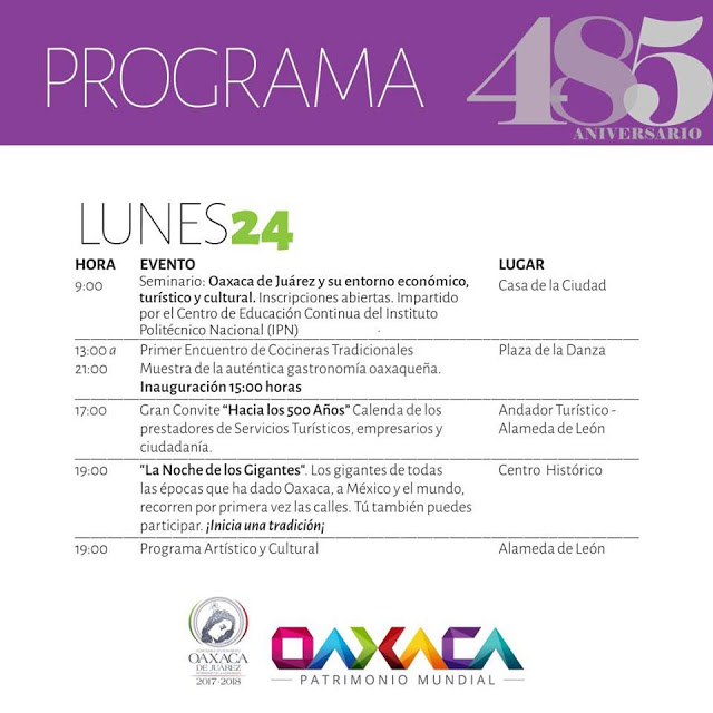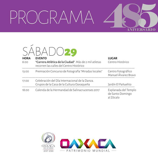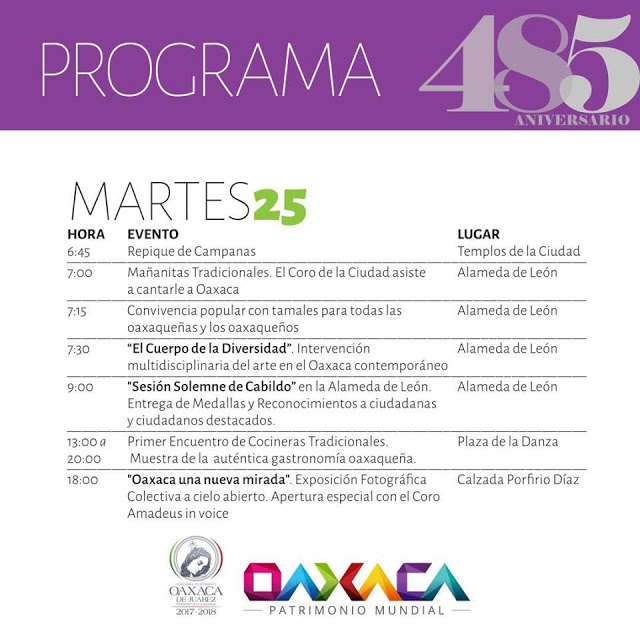 La ciudad de Oaxaca celebra su 485 aniversario el 25 de abril de 2017 y estará de fiesta así que del 24 al 29 de abril de 2017 habrán actividades culturales y gastronómicas en diferentes sedes.