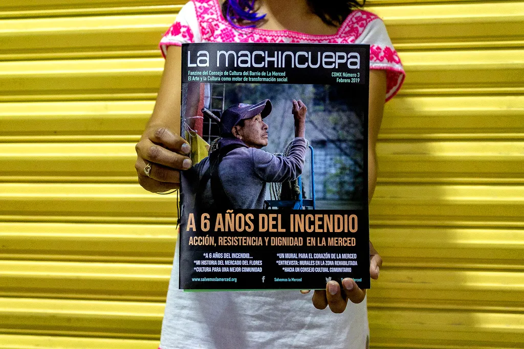 Entonces en ese proceso, y a tres años del incendio, se formó un grupo que se autodenominó Los Olvidados. Ellos son comerciantes que se vieron afectados de manera directa; es decir, que perdieron su local y que, de pronto, estaban vendiendo en la vía pública. Después, este grupo se empezó a transformar poco a poco y abrió el espacio del proyecto editorial de La Machincuepa a las colaboraciones de otras personas que estábamos interesadas en la acción colectiva dentro de La Merced.