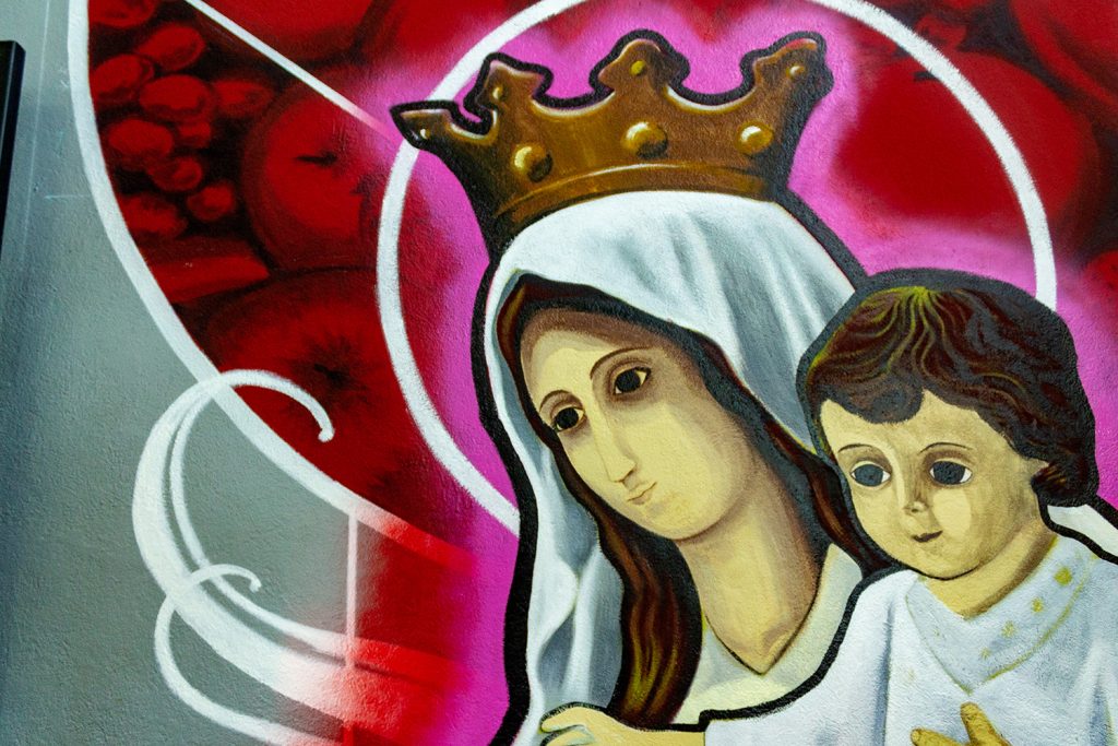 La siguiente parada en este recorrido por los murales de La Merced es la obra inspirada en la Virgen de La Merced, la patrona del barrio y el mercado, a quien cada 24 de septiembre le organizan una gran fiesta para celebrarla.