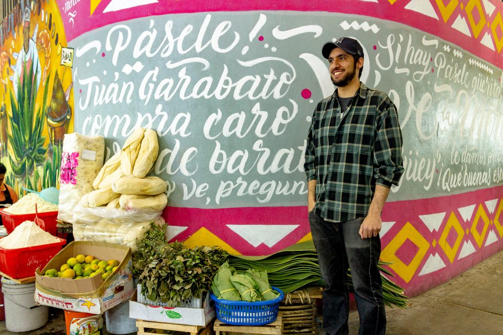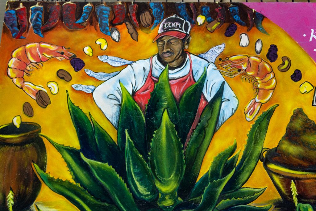 “Entonces se me ocurrió la idea de rescatar el lenguaje del marchante luego de platicar con una señora. Ella me comentó que ya casi todos los chavos preferían ir a un Oxxo o a un Walmart que a un mercado. Yo pensé que se vería bien representar al marchante. Las frases que pinté son las típicas que dicen los locatarios, como ‘¡Pásele, güerita!’. Con este mural simplemente quise reflejar lo que les gusta a los del mercado y su día a día. Por eso las frutas, semillas, chiles y camarones que se ven pintados”.