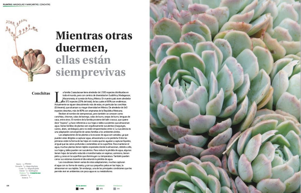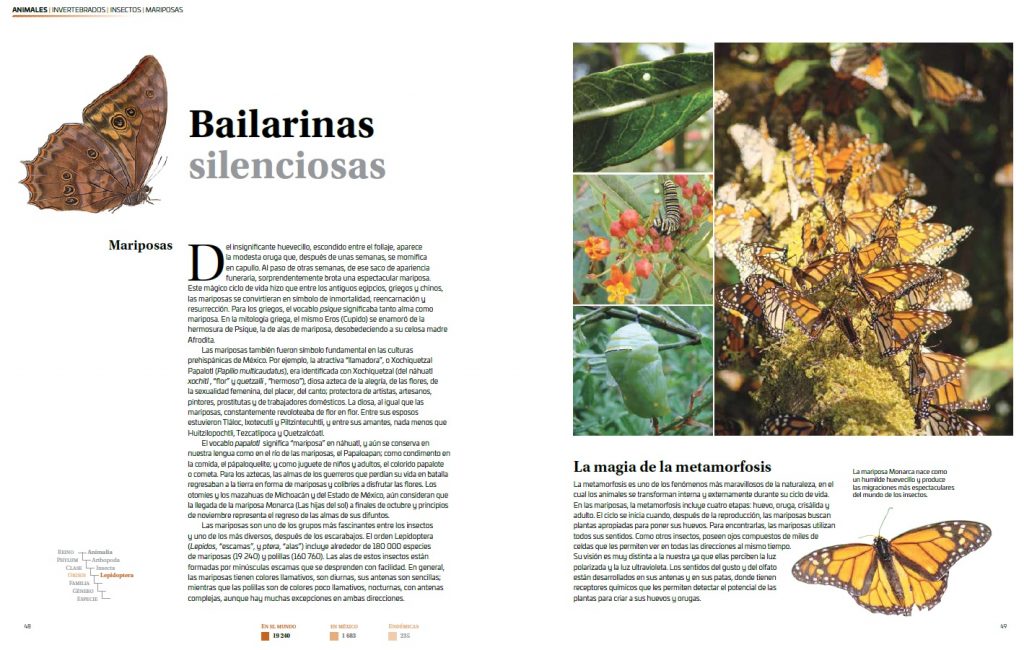 Luego, pasamos por los insectos (arañas, alacranes, mariposas, abejas, caballitos del diablo), y los vertebrados. Por ejemplo, hay un artículo sobre los peces cartilaginosos (tiburones y las rayas), otros sobre anfibios, reptiles, aves (colibríes y pericos) y dos de mamíferos, donde están las ballenas y los reptiles. Y por último, las plantas: hablo de los helechos, los pinos, las margaritas, los cactus, los magueyes, las leguminosas, las orquídeas, los pastos y el maíz”.