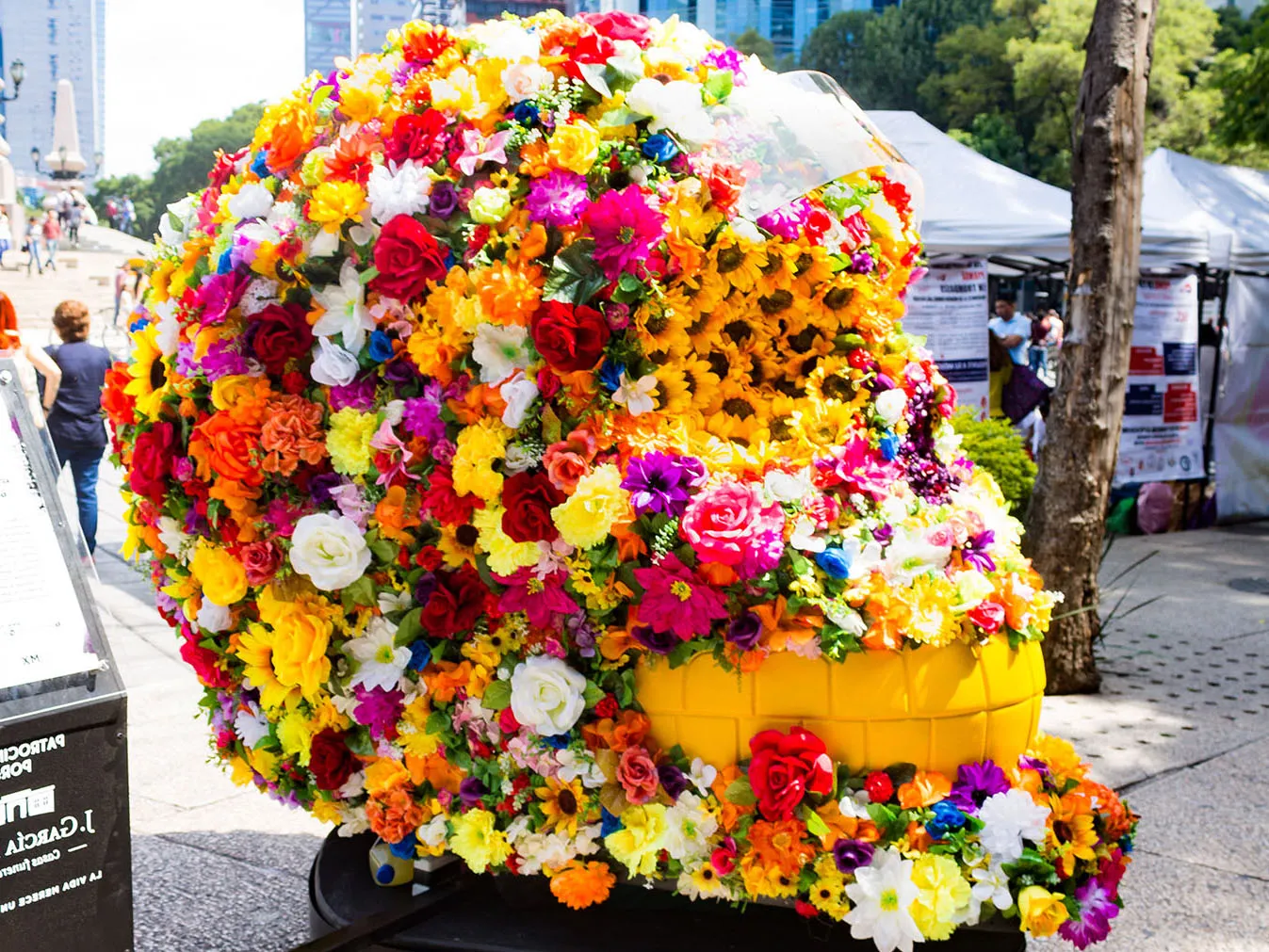 Foto 11: “Mexicráneo floristería” de Phantaus Taller Ensamble es un cráneo que retoma la técnica artesanal basada en flores, una de las más representativas en la Feria del Pueblo Mágico de Huamantla. La celebración data del año 1976 y dura todo el mes de agosto. La fiesta más importante es el día 14, conocida también como “La noche que nadie duerme”, pues se venera la Virgen de la Caridad a través de enormes alfombras y tapetes de flores y aserrín.