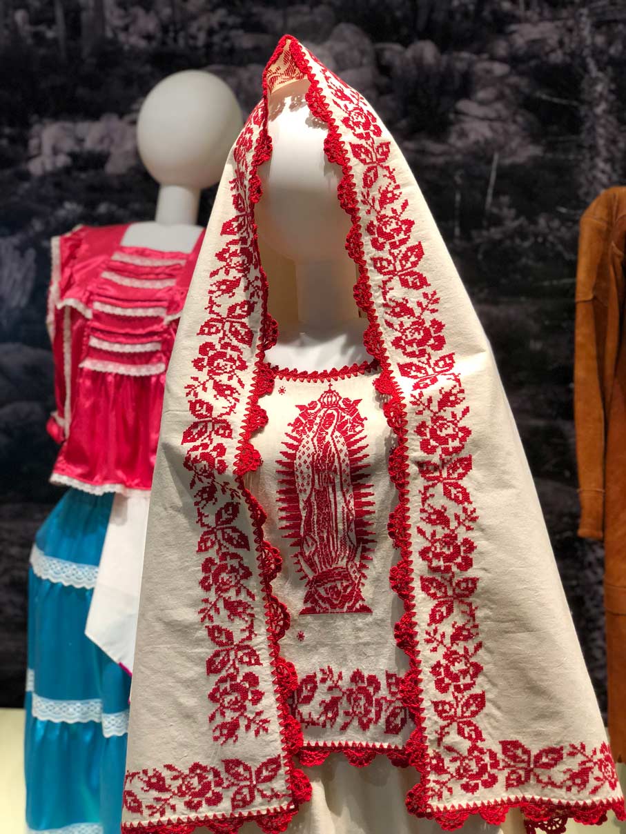 Hay distintos objetos dedicadas a lo fantástico y ceremonial pero en la Sala 2, El Arte Popular y la Vida Cotidiana, se exhiben atuendos, accesorios y joyería de diferentes entidades del país, a fin de que puedas apreciar la diversidad de materiales, diseños y significados sociales y estéticos que tienen.