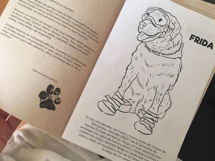 Hace unos días, precisamente en Twitter, vi una propuesta de ayuda muy original pensada para estos tiempos post sismo. Su forma: un mini libro para colorear con ilustraciones de Frida y otros perros rescatistas que en los últimos días se han convertido en un símbolo, no solo por las personas que han salvado de los escombros sino por su look, con botas en sus peludas patas y goggles para proteger sus ojos perrunos.