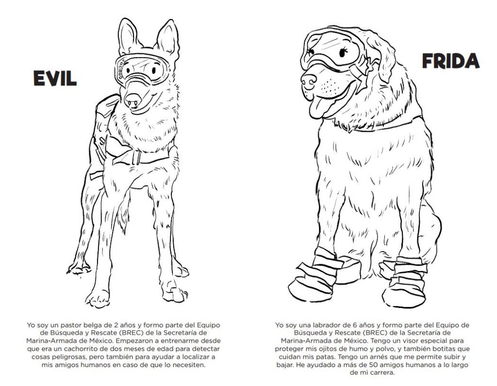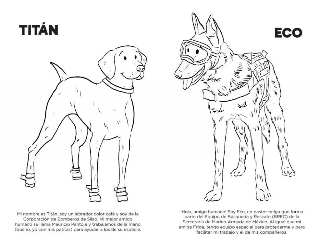 Frida y otros perros rescatistas mexicanos en un libro (gratuito) para colorear