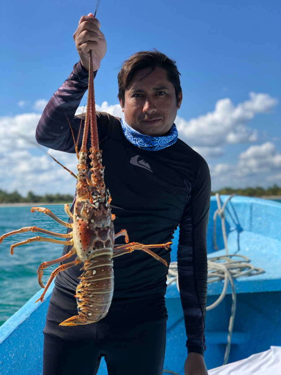 Más adelante durante el trayecto encontrarás a hombres como Jesús Pereyra y Alejandro Cuxim, quienes se dedican a la captura de langosta espinosa. Ellos pueden pasar hasta más de cuatro horas por jornada laboral buceando desde 3 hasta 15 metros de profundidad para pescar este crustáceo cuando no está en veda (marzo a junio): podrás sumergirte para ver cómo trabajan y apreciar cómo llegan a tu plato.