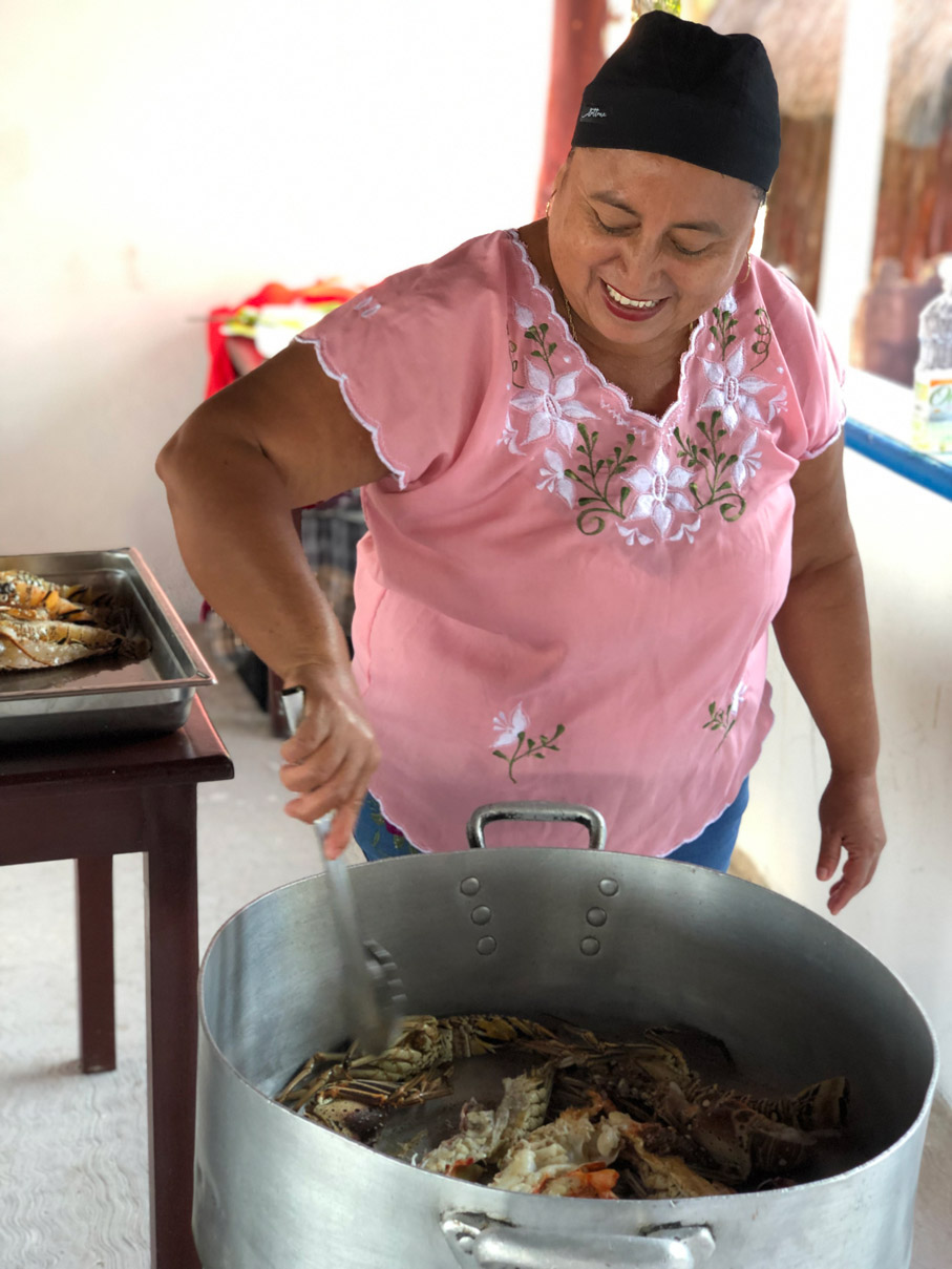 Ya en tierra, Lucia Cosgaya y Guadalupe Cocom, cocineras y esposas de pescadores, puede enseñarte más sobre la preparación de diferentes pescados locales y langosta, así como de otros ingredientes como el coco y sus derivados y procesos (leche, aceite, pulpa y más). Podrás tomar con ellas un taller de cocina, así como comer exquisito y natural, pues su alacena es lo que tienen a la mano.