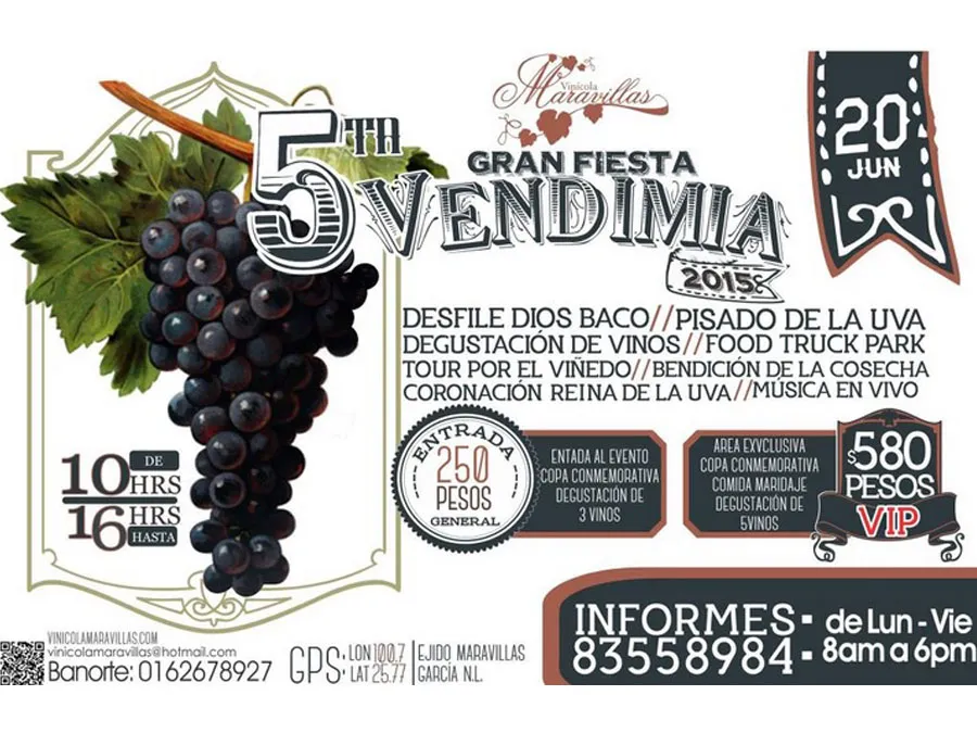 ¿Por qué te platico sobre la vinícola Maravillas? Porque el próximo 20 de junio organiza para ti, la Quinta Gran Fiesta Vendimia 2015. Es un evento que contará con degustación de vinos, pisado de la uva, tours por el viñedo, bendición de la cosecha, coronación de la reina de la uva, food truck park y mucha música en vivo.