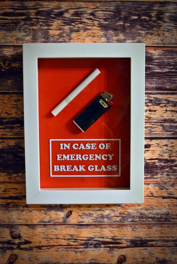 Si tu chico fuma, regálale un cuadro que pueda colgar en su cuarto muy bien hecho con un cigarro y un encendedor al centro con la leyenda “Rómpase en caso de emergencia”. Es original y muy económico. Básate en la imagen de abajo para su diseño: