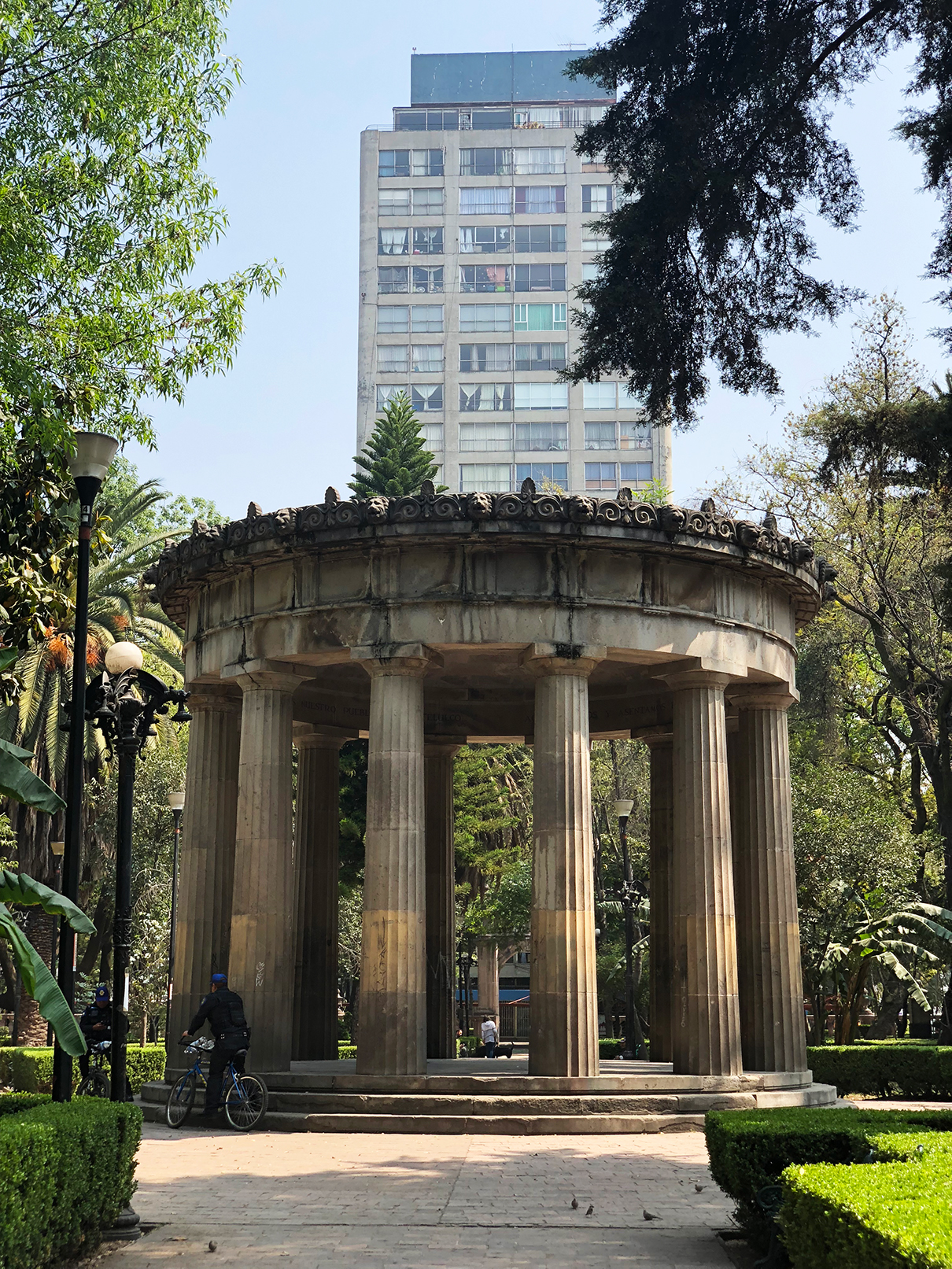 La caminata nos llevó hasta este jardín que es un oasis verde. Es impresionante cómo al sentarte en sus bancas interiores, te abstraes del ruido de la avenida. Había varias personas comiendo su itacate de medio día y una enfermera paseando a un abuelito. Su barda perimetral es de cantera y cuenta con 62 especies diferentes de plantas y árboles. Este es una réplica del Jardín de San Marcos en Aguascalientes, donde vivió Mario Pani.