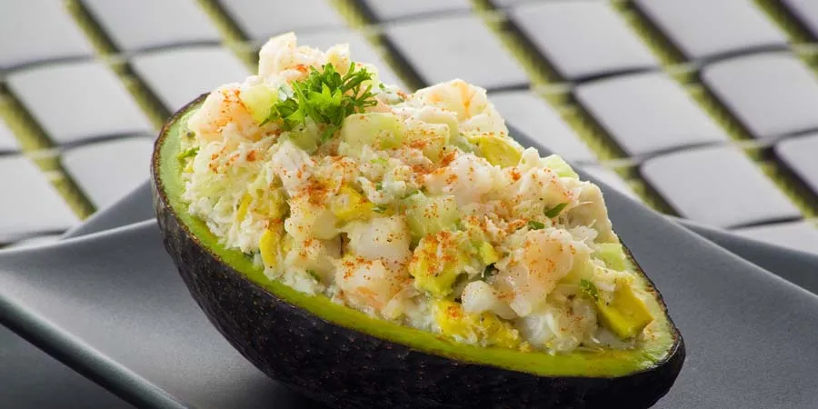 - Rellena los aguacates con la mezcla de camarón, decora con albahaca y la fresa cortada a la mitad.