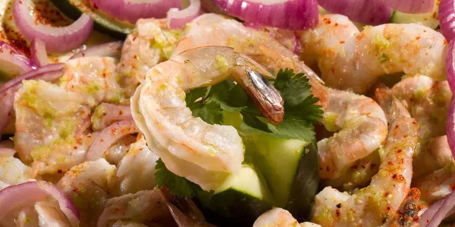 - Sobre un platón, ve acomodando acomoda los camarones. Sazónalos con sal, pimienta, la salsa inglesa y el chile en polvo. Coloca sobre ellos la cebolla.