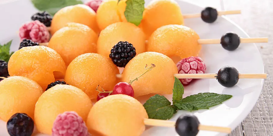 - Coloca una perla de melón y una de sandía en los palitos para brocheta.