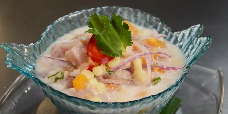 - Coloca el pescado, la sal, la leche de tigre, el chile en brunnoise, la cebolla roja en juliana y un cubo de hielo.